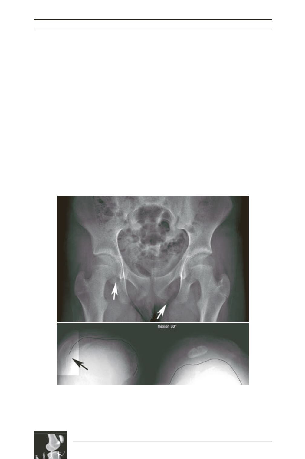 notches (arrow) and elongated femoral necks (up). Permanent patellar dislocation on